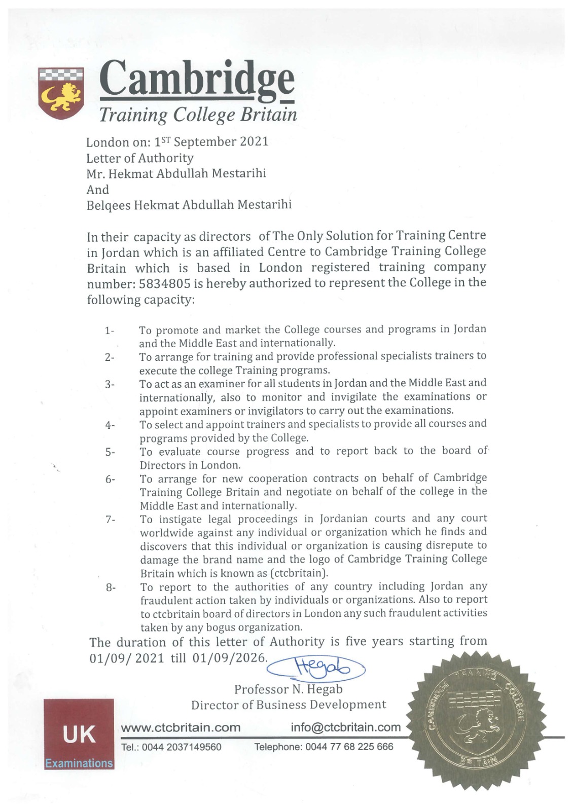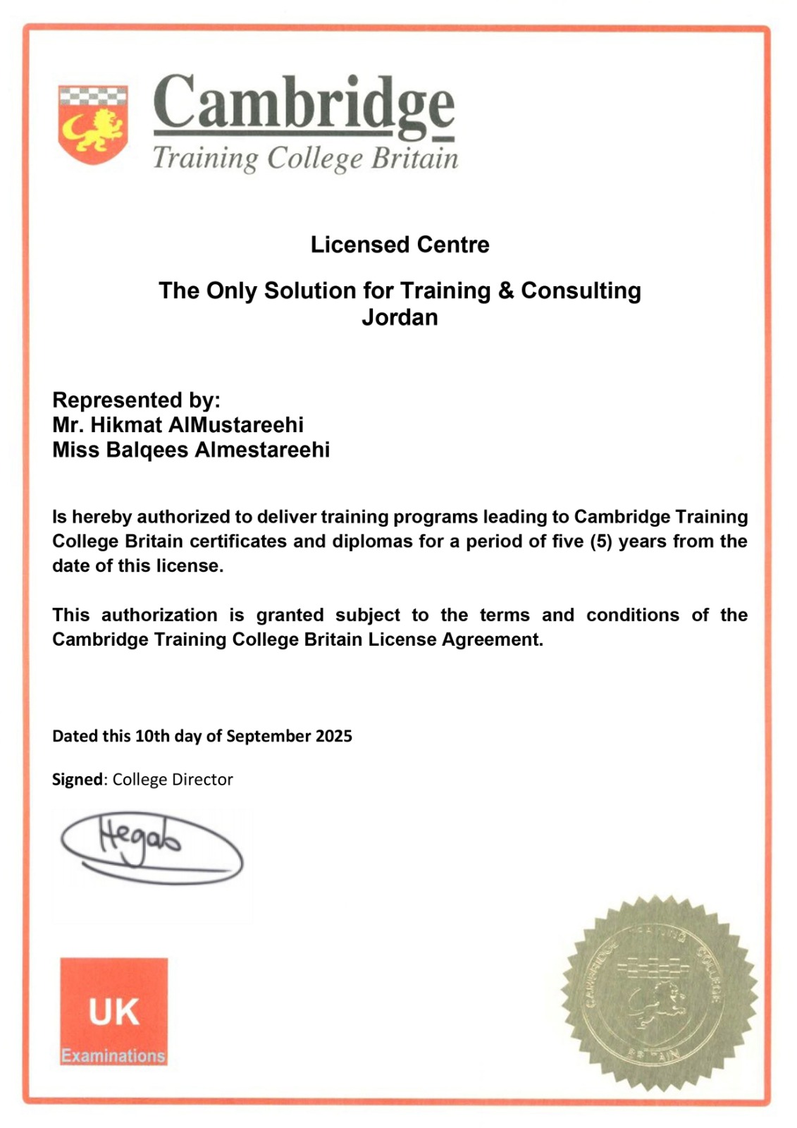 بفضل شراكتنا الاستراتيجية مع كلية كامبردج البريطانية للتدريب)  Cambridge Training College Britain)، لدينا عضوية تخولنا من إستخدام موادهم ومناهجهم التدريبية، مما يضمن لشركاء نجاحنا الحصول على شهادات معتمدة دوليًا وقابلة للتصديق من وزارة الخارجية البريطانية.